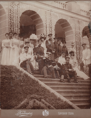 На ступенях сидят: Великий князь Николай Николаевич Младший, генерал-лейтенант А.Н. Николаев, Великий князь Андрей Владимирович, Великий князь Борис Владимирович, князь императорской крови Георгий Максимилианович Романовский, герцог Лейхтенбергский. Во втором ряду сидят Великая княгиня Мария Павловна, Великий князь Павел Александрович. В третьем ряду третья слева стоит Великая княгиня Елена Владимировна, крайний справа стоит Великий князь Владимир Александрович. Между Великой княгиней Марией Павловной и Великим князем Павлом Александровичем стоит О.В.Пистолькорс (возлюбленная, впоследствии жена Великого князя Павла Александровича).
